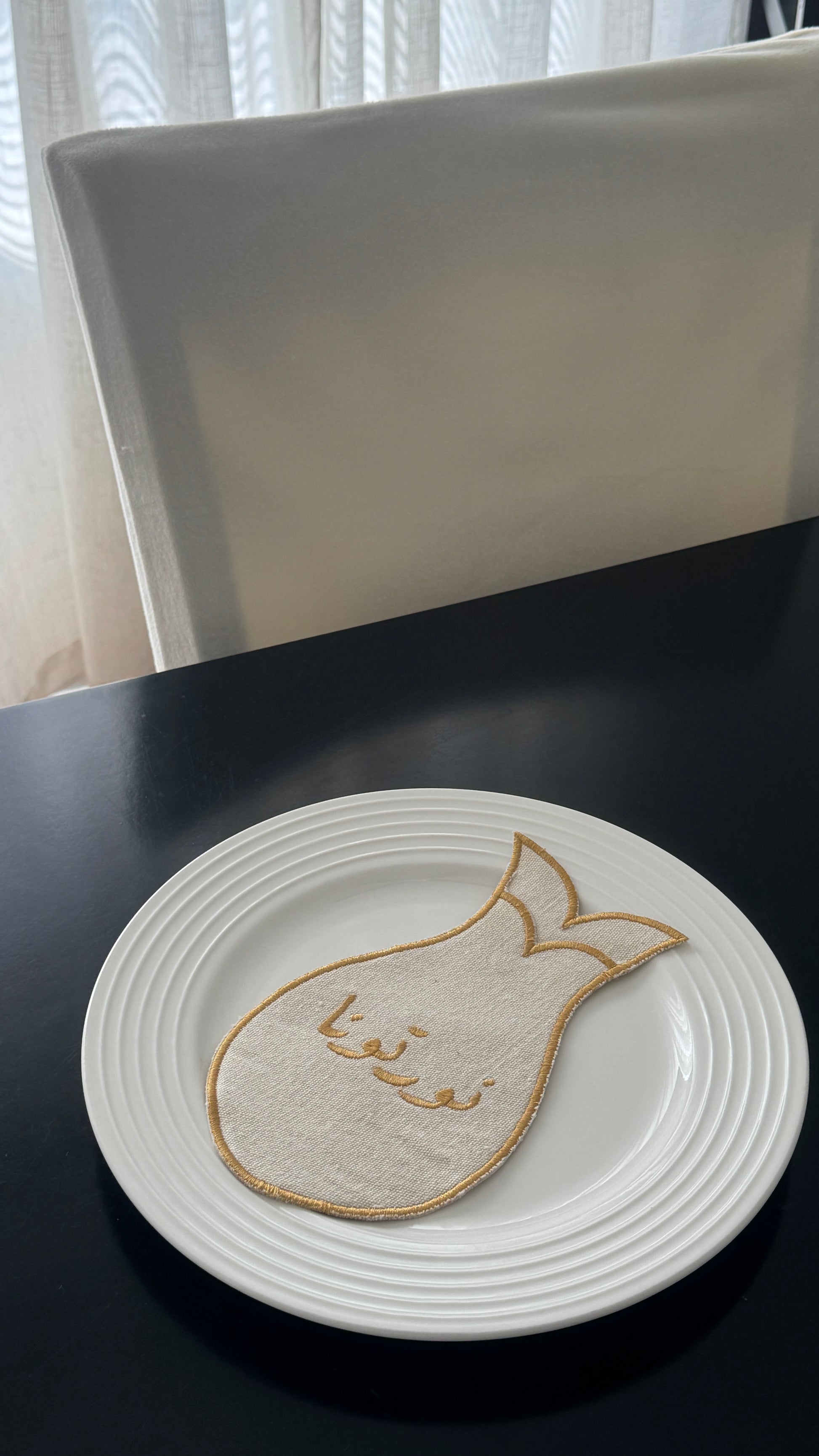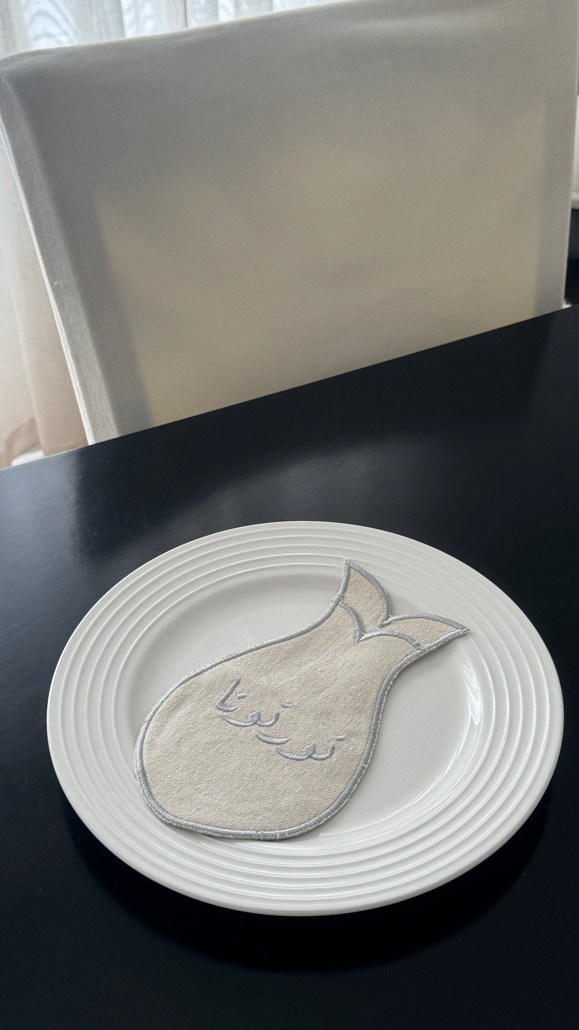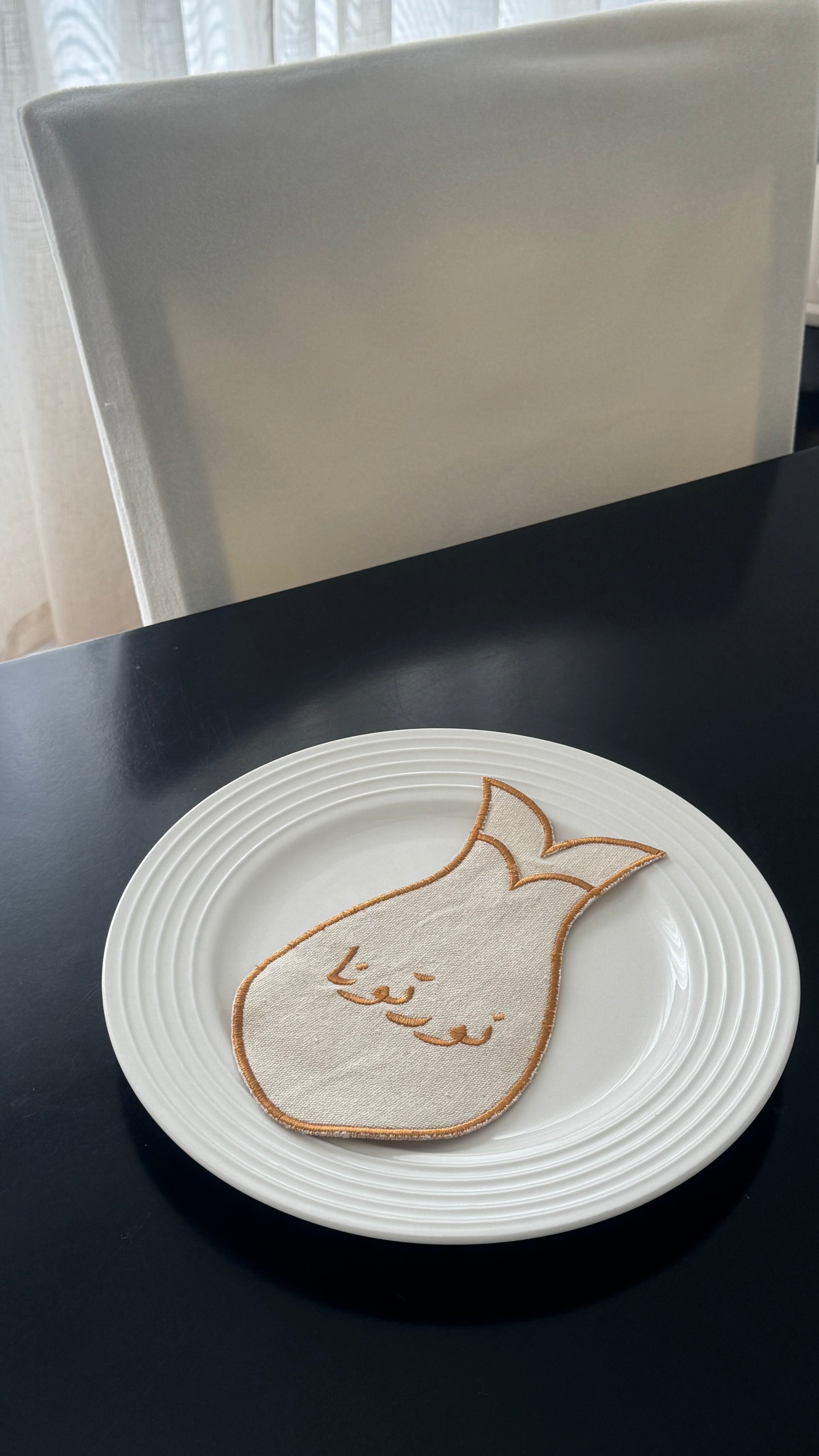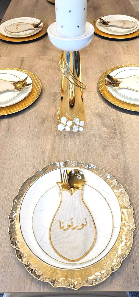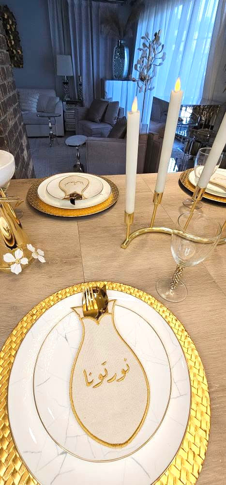 قطعة ديكورية أنيقة لطاولات الطعام، مطرزة بخيوط حرير على قماش كتان فاخر. مناسبة للاستخدام على الأطباق، حيث يمكنك وضع السكين والملعقة والشوكة بداخلها.
