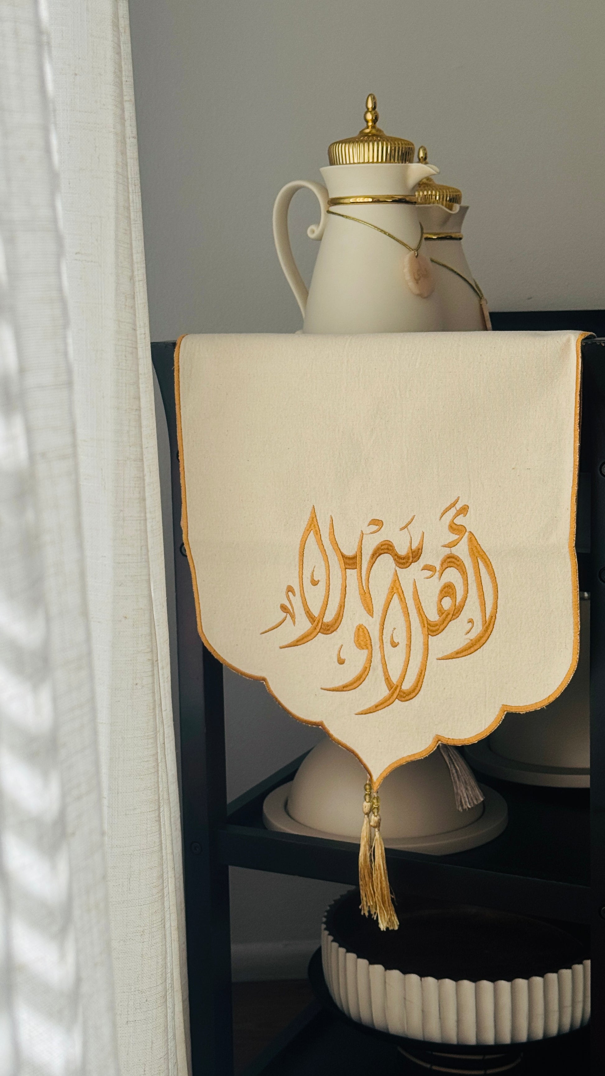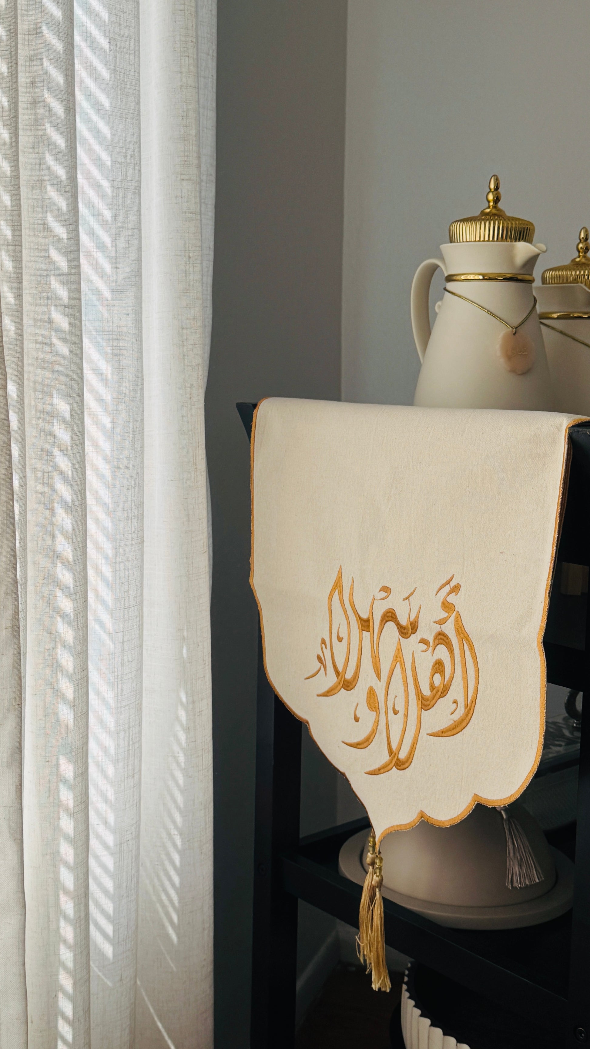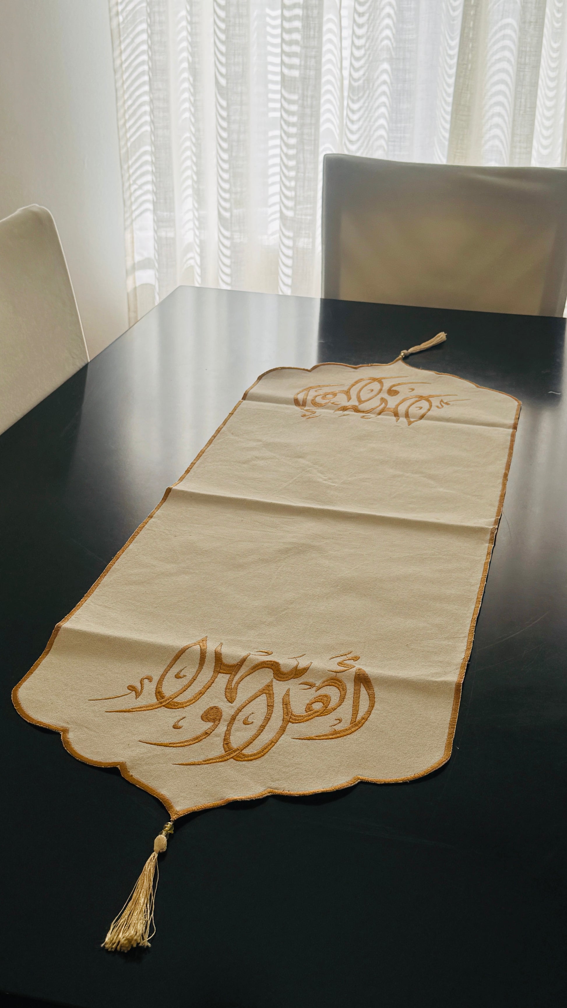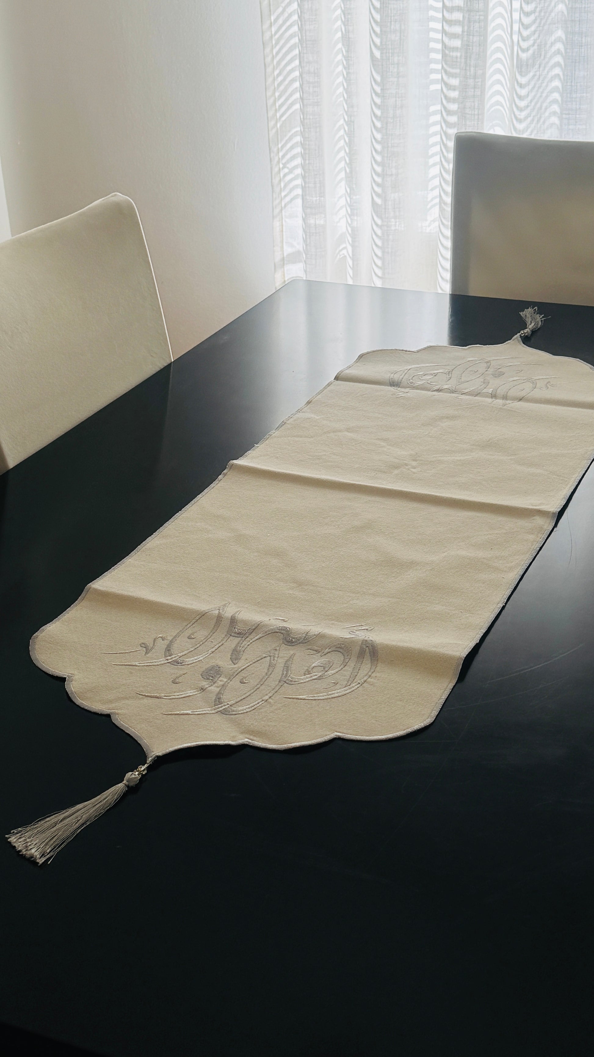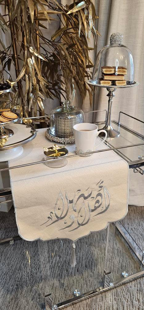 مفرش طاولة للضيافة، يتميز بتطريز بخيوط حرير على قماش كتان فاخر للغاية. مناسب للاستخدام على الصواني، أو أطباق التقديم، أو تحت وحدات التلفزيون، أو على الكونسول عند المدخل.